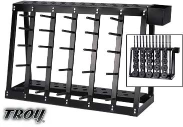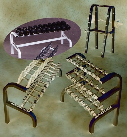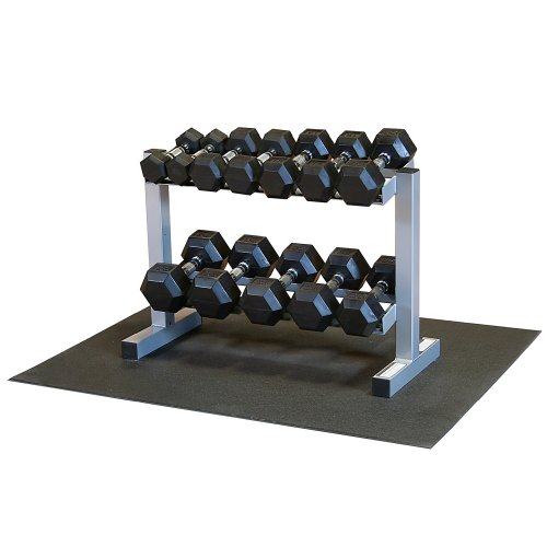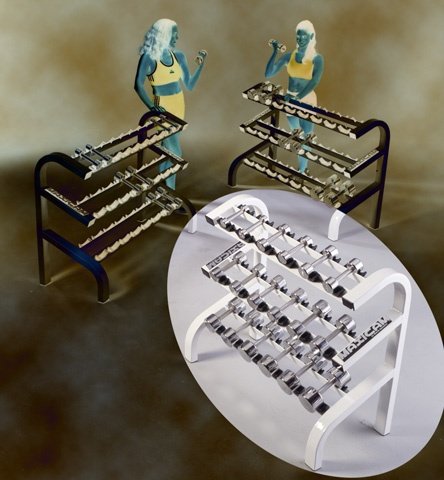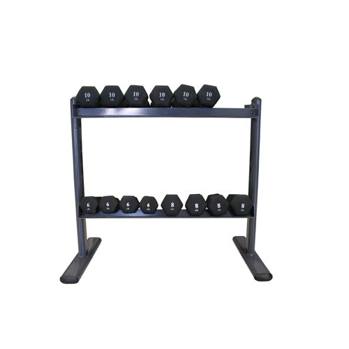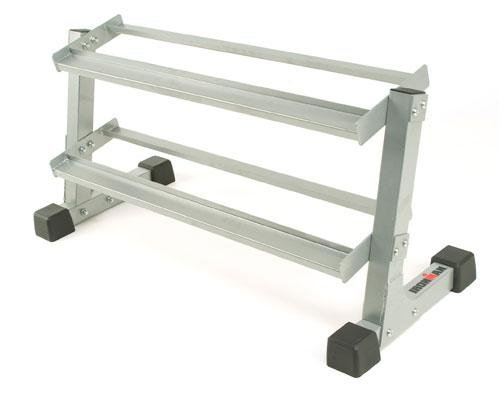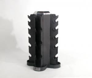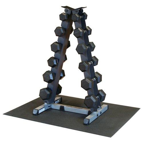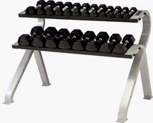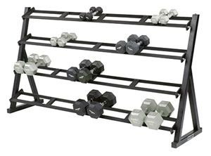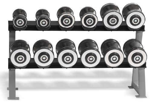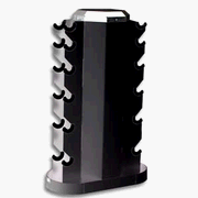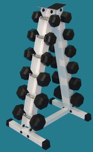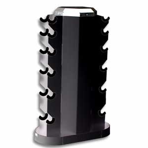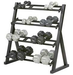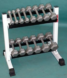 > By Cap Barbell > Two-Sided Vertical Dumbbell Rack > Holds One Pair Of Each 5-30 lbs Hex, Rubber Hex, or Chrome Dumbbells > Heavy-Gauge Steel > Maximum Durability > Space Saver > Rubber Contact Points > Black Finish Strength training refers to the usage of various equipment, such as benches, weight sets, dumbbells, weighted vests, etc. to add resistance to exercise. Strength training brings about a great many benefits, such as: thicker, stronger bones (important for women 30 years of age and up - reducing/eliminating chance of osterioperosis), increased strength/muscle tissue, increase of 'good cholesterol', improved joint function, fat loss, weight (muscle) gain, tougher tendoms and ligaments, and finally, excellent cardiovascular fitness. This type of conditioning also significantly reduces stress, increases energy level and reduces the chance of injury and disease (allows the body to function properly). .