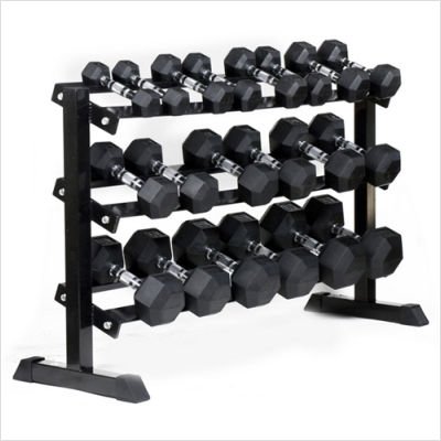 | J Fit Horizontal dumbbell rack holds multiple styles of dumbbells. Rubber-lined trays protect dumbbells and reduce noise. It holds 6 to 9 pairs. Steel construction. Assembly required. Ships in 2 boxes. Dumbbells sold separately. Features: -Horizontal dumbbell rack. -Color: Black. -Overall Dimensions: 58" H x 21" W x 33" D. 10-0300 |