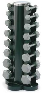 Takes up minimal floor space. Holds up to eight pairs of dumbbells from 3 - 25 lbs (not included). All welded frame for stability and durability.